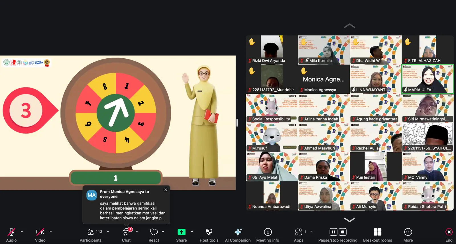 Conducted online via Zoom, the event was attended by 130 enthusiastic participants from various regions across Indonesia. During the session, participants were introduced to practical strategies for integrating gamification into classroom curricula. Key topics included techniques for crafting effective prompts to generate game assets, transforming learning materials into interactive quizzes, and maintaining substance while making lessons more engaging for students.